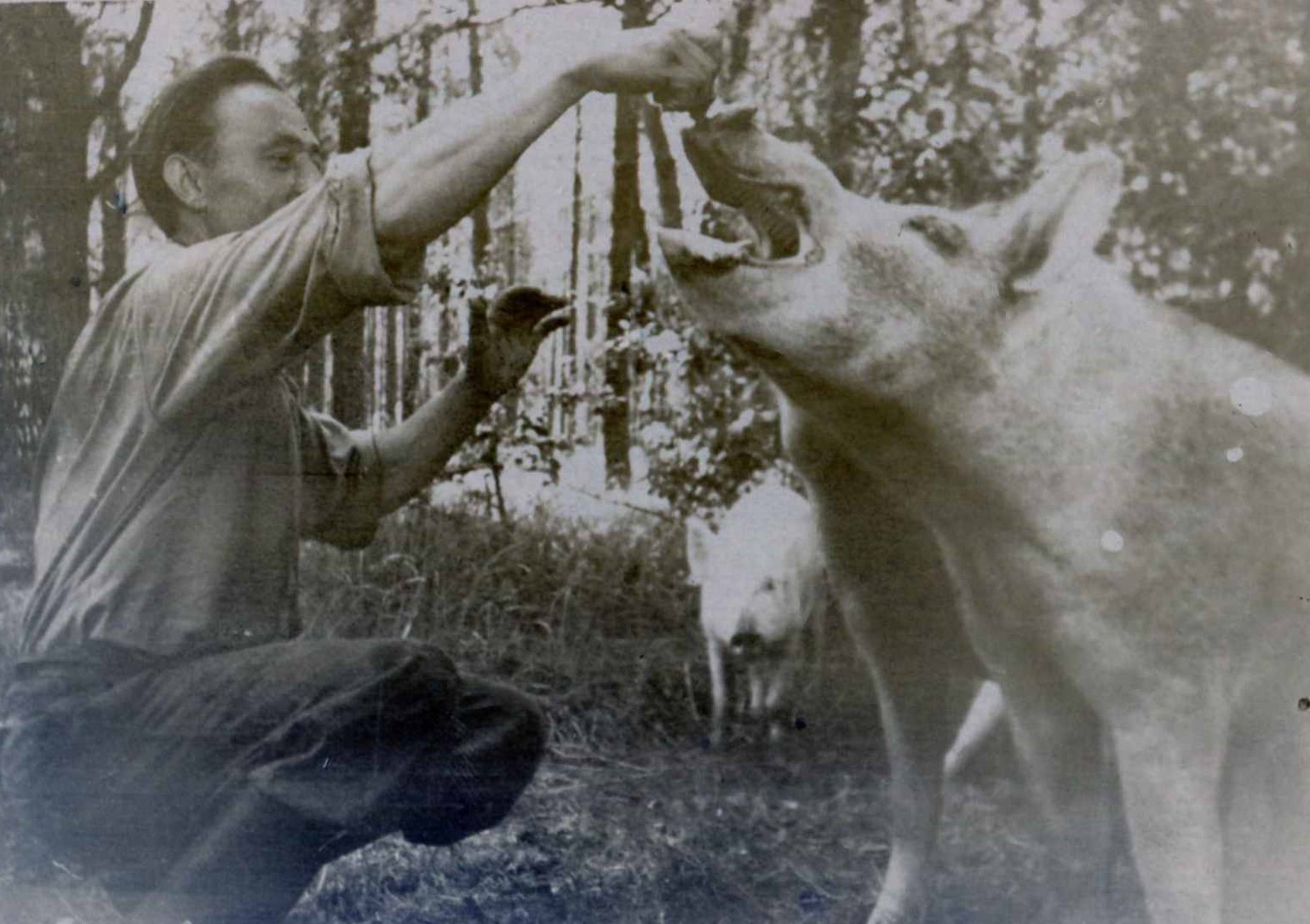 Medību saimniecības projekts par Ukrainas šķirnes cūku piejaucēšanu Latvijas mežos. Cūkas tika audzētas Ugāles "Stiebriņos". Attēlā Kārlis Amers