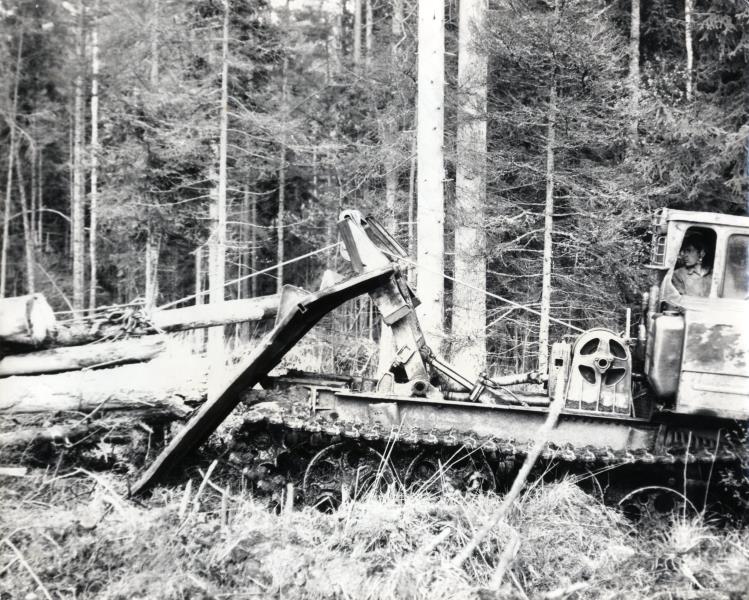 Traktorists I. Aleksejevs darbā uz traktora TDT-55, stumbru pakas formēšana