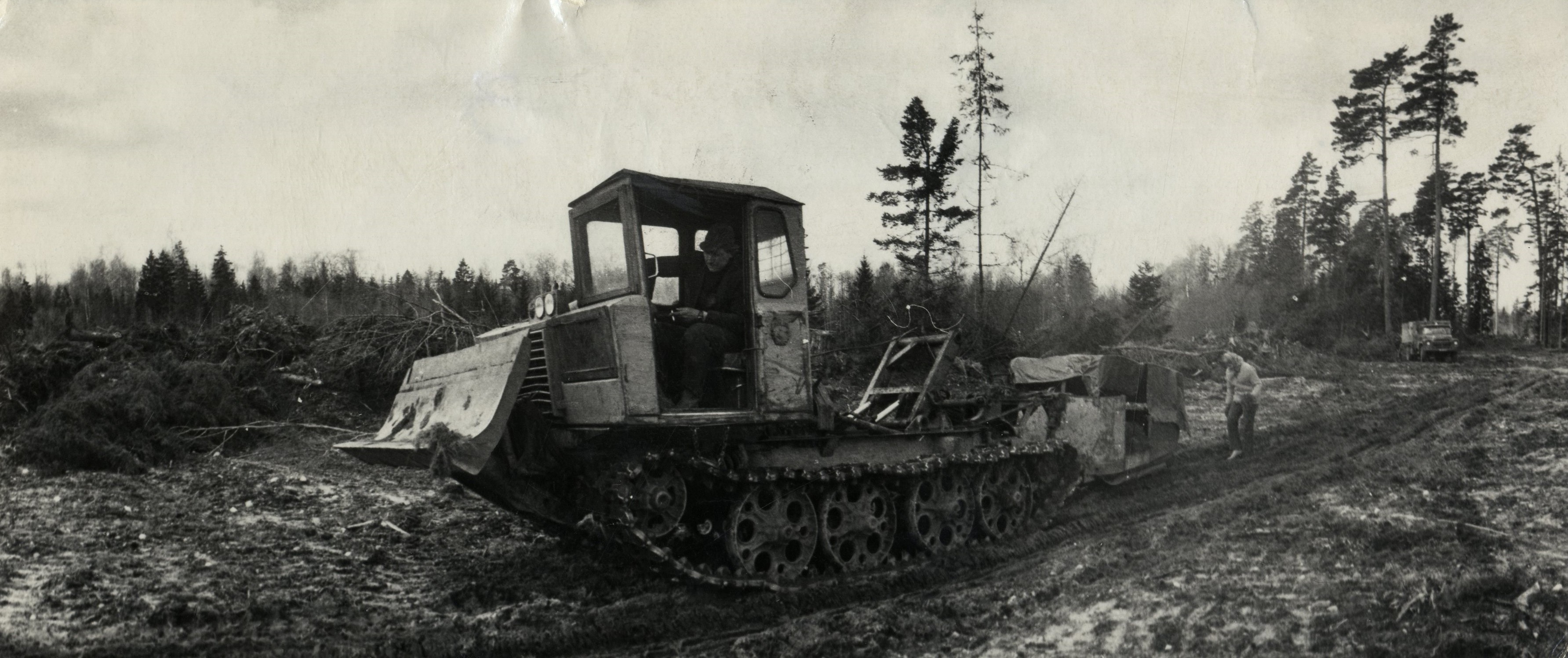 Mežsaimniecības Ugāles iecirkņa darbinieki strādā pie cirsmas sagatavošanas meža stādīšanai