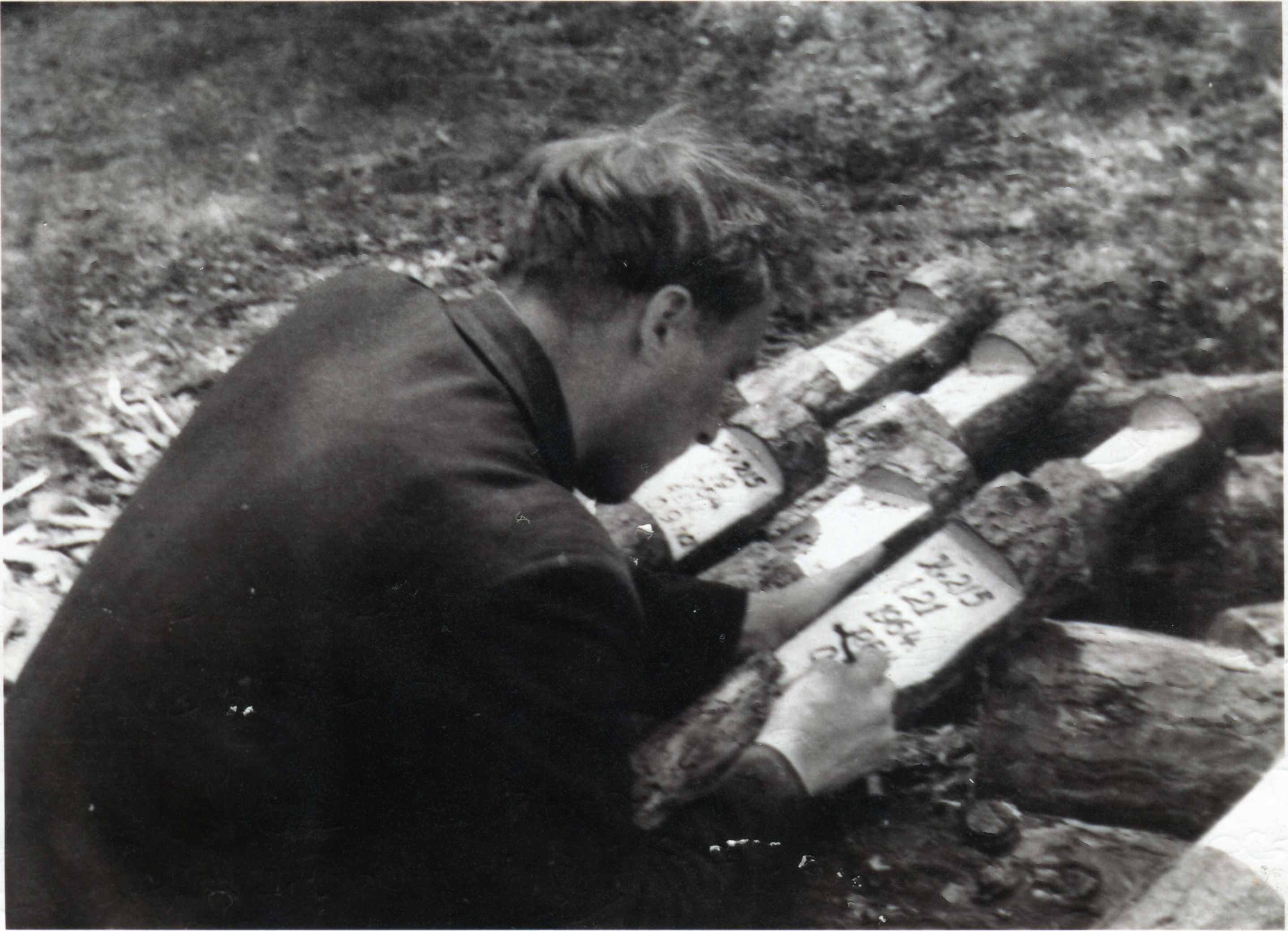 Gunārs Amers, Ugāles MRS fonda inženieris, palīdz mežsargam pie Lielo stūres stabiņu noformēšanas. 1. kvartāls; 2. nogabals; 3. darba veikšanas gads; 4. cirtes veids(C- kailcirte, Skja - skrajcirte, Ret - retināšana, A - atēnošana, Smt - smalctīre, St- stādīšana)