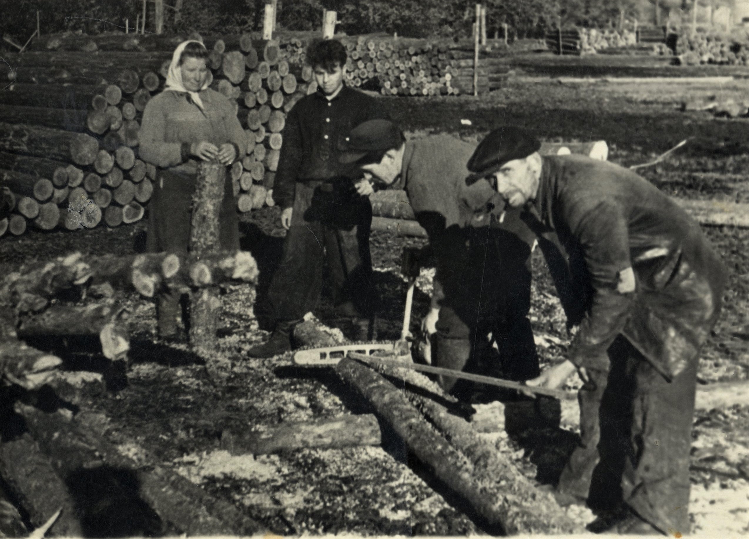 Koku sagarināšana Ugāles MRS krautuvē, ar elektrisko zāģi strādā Bērtulis Ūrmanis