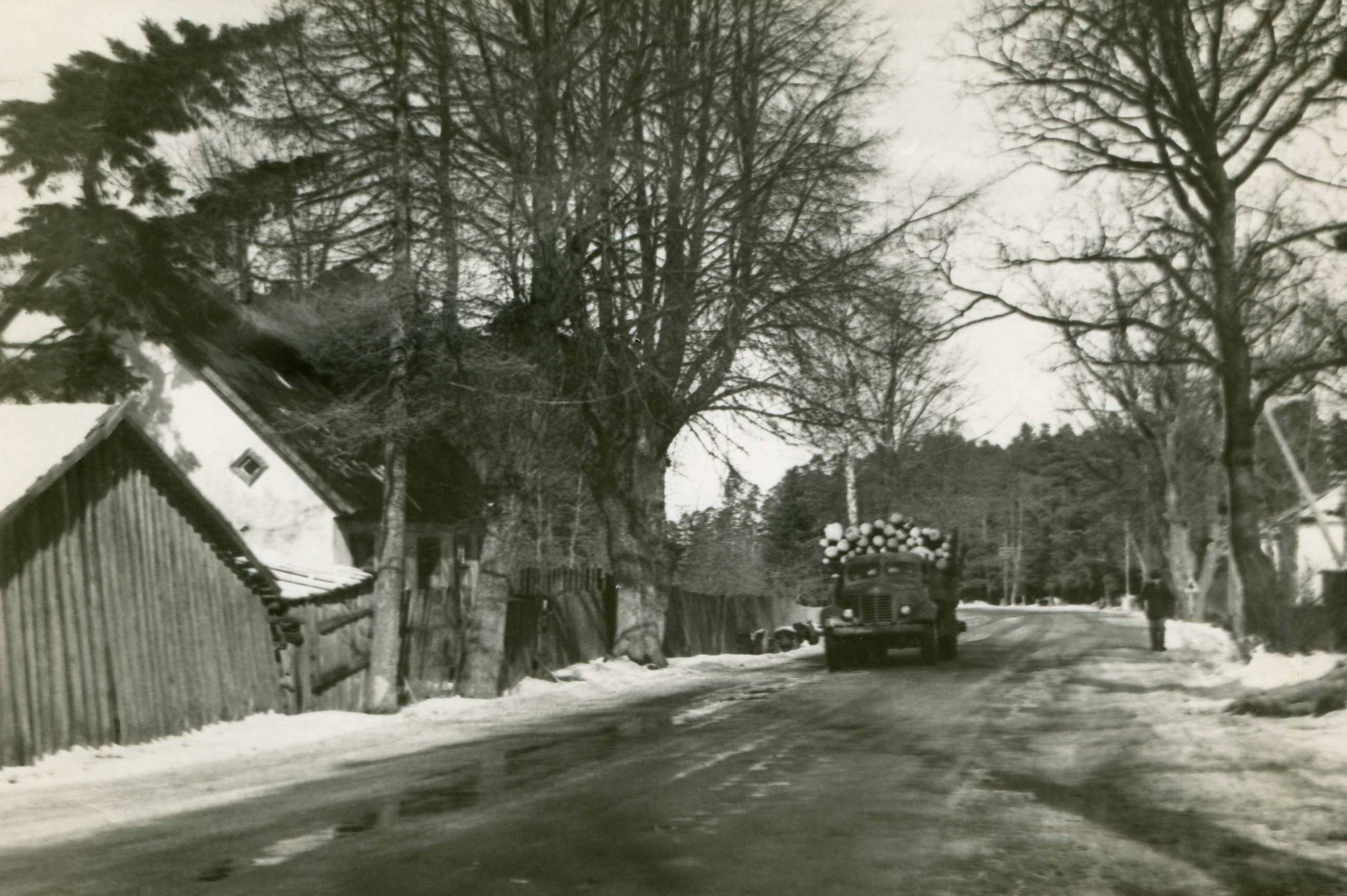 Baļķvedējs ZIS-150 iebrauc Ugālē no Ventspils puses