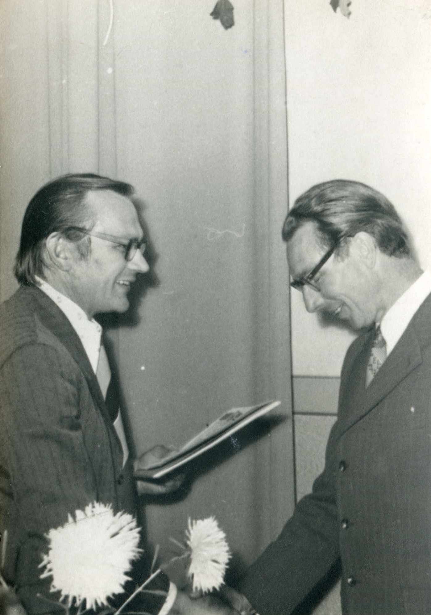 Ventspils rajona darbaļaužu deputātu padomes izpildu komitejas priekšsēdētājs A. Čepānis sveic MRS direktoru V. Fišeru. (Direktors no 1972. gada)