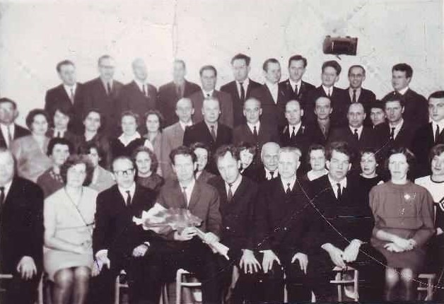 1. un 2. rindā no kreisās: X, Velta Vaikevica, Roze, X, Viesturs Roze, Brigita Šēniņa, direktors Gunārs Jansons, X, Gunārs Amers, Ruta Sarkangalve, Arnolds Cukunde, Arvīds Birziņš. X, Andris Lūsis, X, Vita Grāvere, Kreislere. 3. rindā: Antons Butkēvičs, Broņislava Butkēviča, Dagnija Šmite, Olga Doroško, Maiga Erdmane, Dzidra Lēle, Edgars Krams, Pēteris Doroško, Alfrēds Hartmanis, Arnolds Sproģis, Žanis Valdmanis, Boriss Tankelsons, Indulis Lasmanis, X, Austris Kreislers. 4.rindā: Fricis Kalniņš, Imants Lēlis, Viesturs Indāns, X, Vasilijs Tararujs, Arvīds Osis, Gunārs Akmeņkalns, Aivars Mačtams, X, Paegle, Ēriks Plūksna