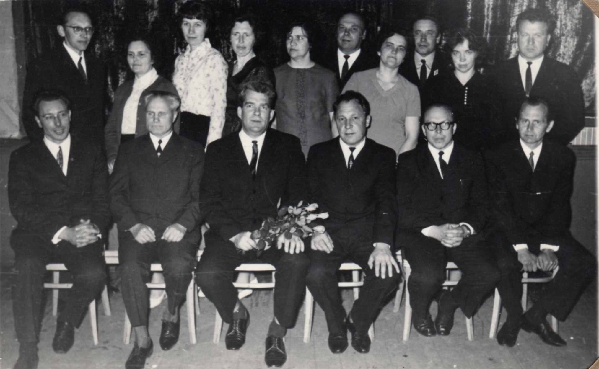 1. rinda no kreisās: 2. Birziņš - grāmatvedis, 3. Andris Lūsis - galvenais mežzinis, 4. Gunārs Amers - partorgs un fondu inženieris, 6. Gunārs Ameņkalns; 2. rinda no kreisās: 1. Lēlis, 2. Lēle, 3. Ruta Sarkangalve -meistare, 4. Vita Posiņa, 7. Olga Doroško - grāmatvede, 9. Velta Dronka