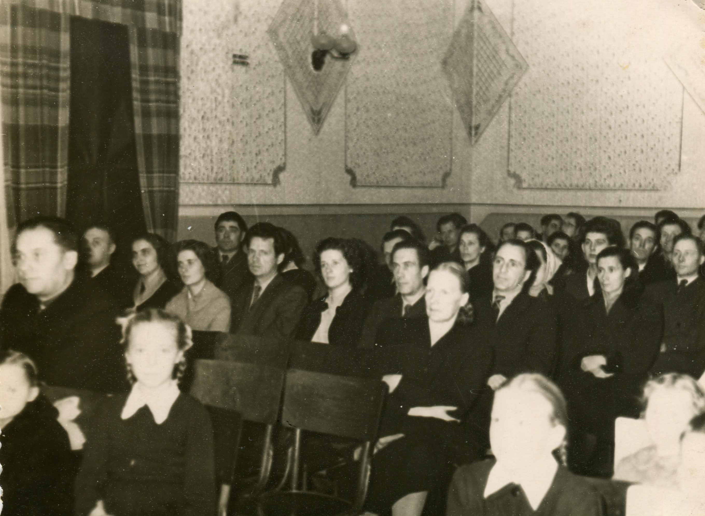 Pasākums MRS zālē. No labās: Trofims Očkovskis, Ugāles MRS direktors no 1951.-1963. g, aizmugurē Gunārs Jansons
