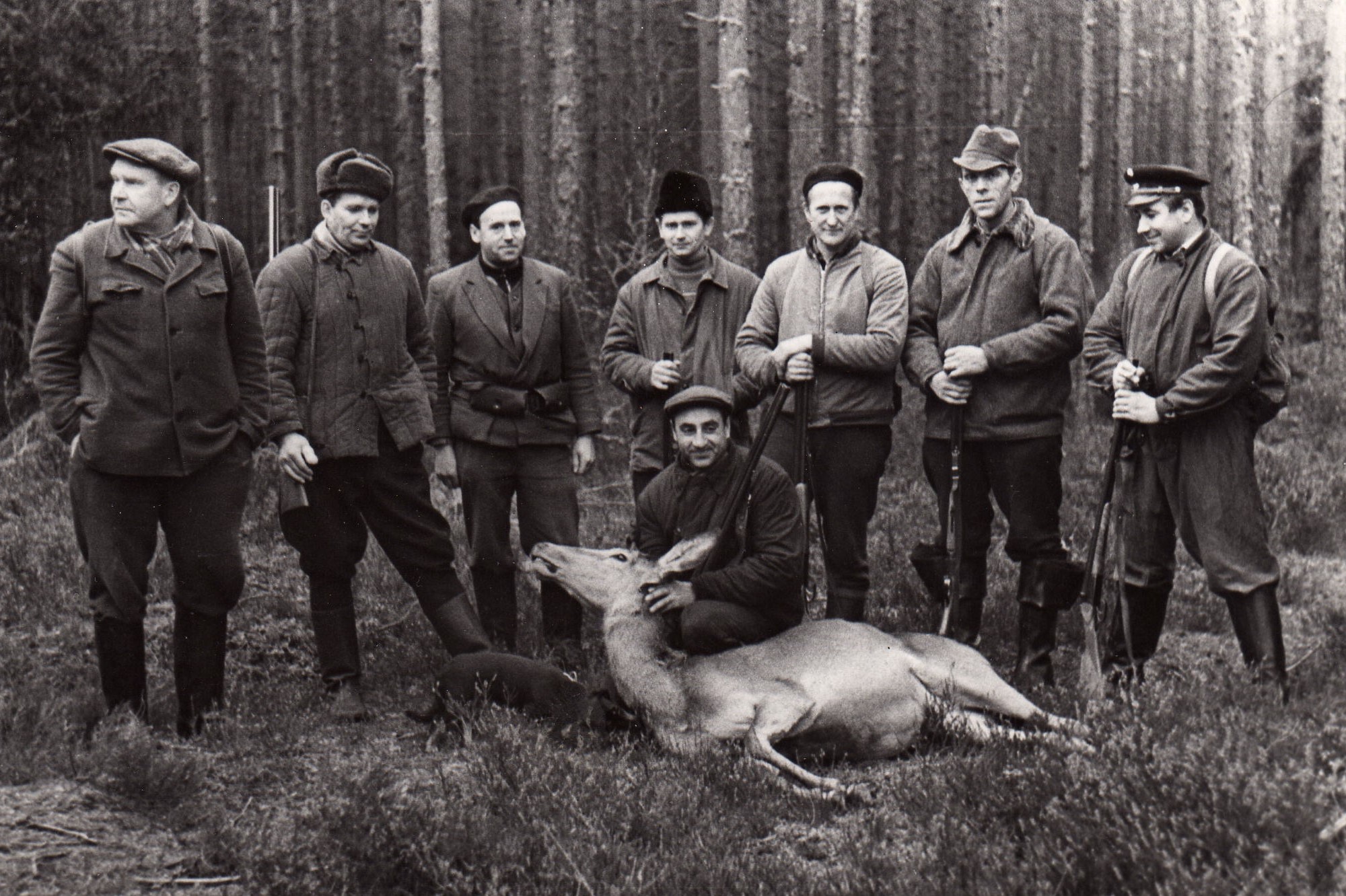 Pie briežgovs Polis Antons. No kreisās: mežsargs V. Ansons, virsmežzinis Andris Lūsis, Arnolds Sproģis, Gunārs Akmeņkalns, Vilnis Erdmanis, Voldemārs Drieks, Jānis Ansbergs