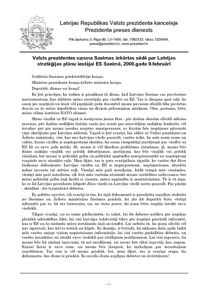Valsts prezidentes uzruna Saeimas ārkārtas sēdē par Latvijas stratēģijas plānu iestājai ES Saeimā, 2000.gada 9.februārī
