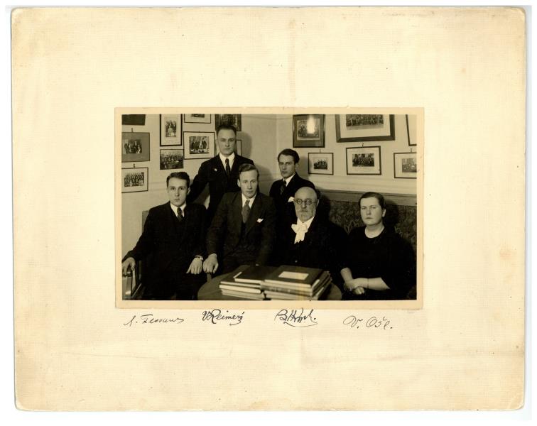 1. rindā no kreisās puses: Aleksandrs Feodorovs, Ādolfs Skulte, Jāzeps Vītols, Velta Oše; 2. rindā no kreisās puses: Vilis Reimers, Bruno Skulte. Uz fotogrāfijas - A. Feodorova, V. Reimera, B. Skultes un V. Ošes autogrāfi.
