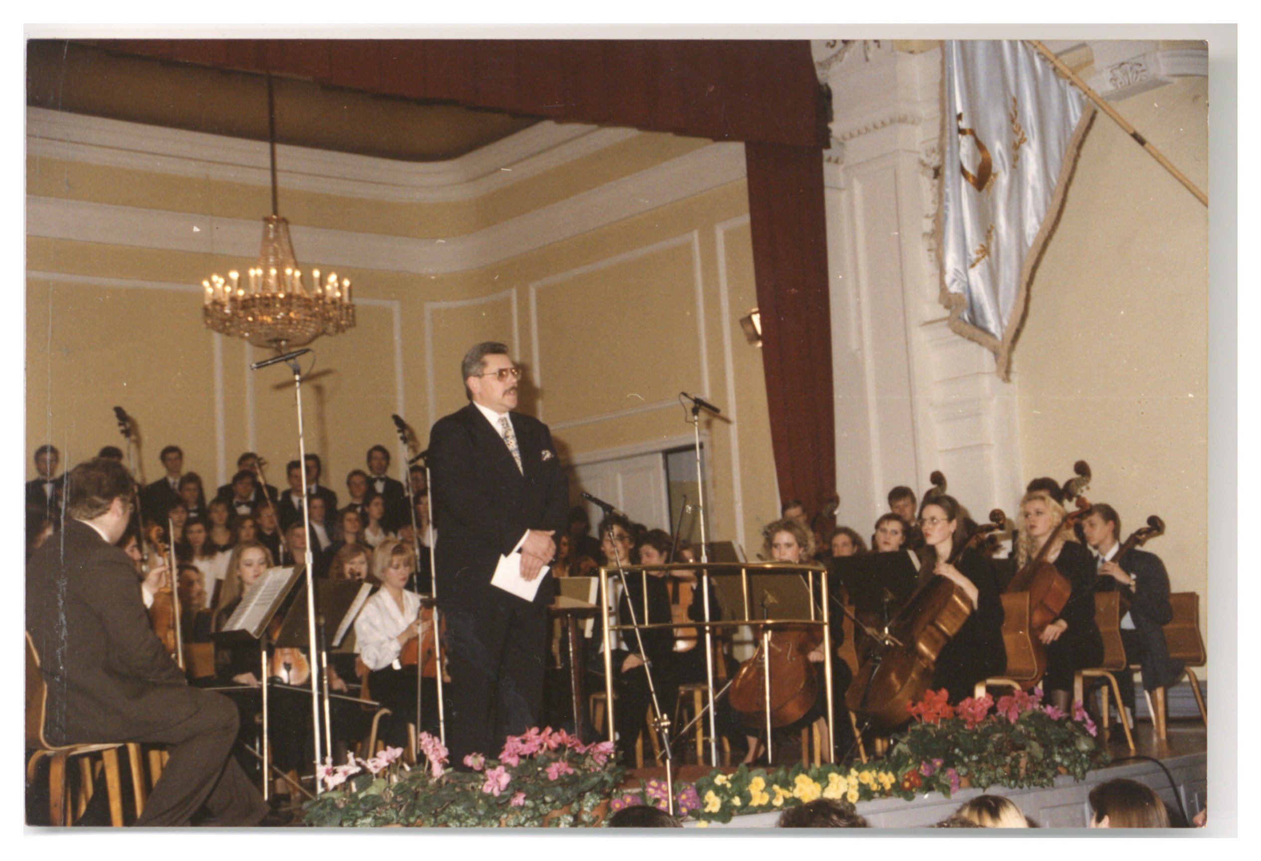 Svinīgais koncerts JVLMA Lielajā zālē. Uz skatuves JVLMA jauktais koris un simfoniskais orķestris, centrā JVLMA rektors Juris Karlsons
