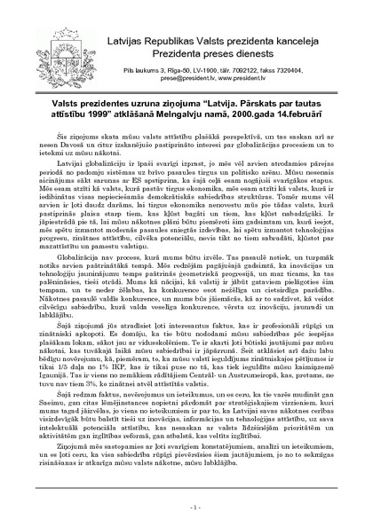 Valsts prezidentes uzruna ziņojuma “Latvija. Pārskats par tautas attīstību 1999” atklāšanā Melngalvju namā, 2000.gada 14.februārī