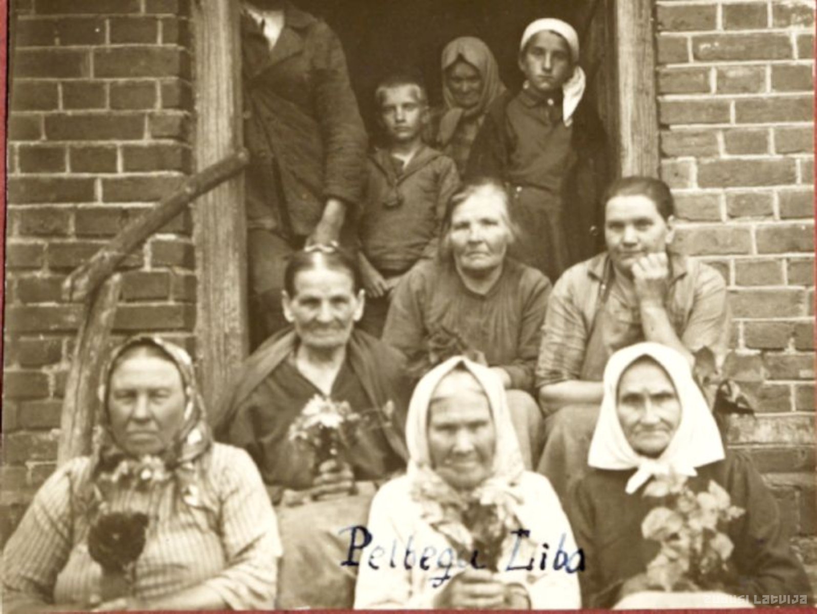 Ceraukstes nespējnieku nama iemītnieki. Pirmajā rindā vidū teicēja-dziedātāja Pelbeģu Libe