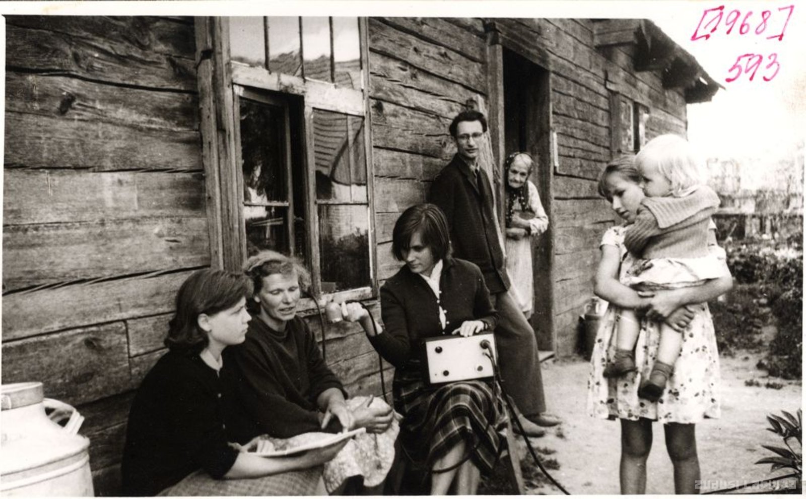 Latvijas Zinātņu akadēmijas Valodas un literatūras institūta (tagad nosaukums Latvijas Universitāte. Literatūras, folkloras un mākslas institūts) darbinieces A. Ancelāne un R. Skudra pieraksta materiālus no teicējām Mades Blūmas un Almas Radzovskas Dobelē 1964. gadā