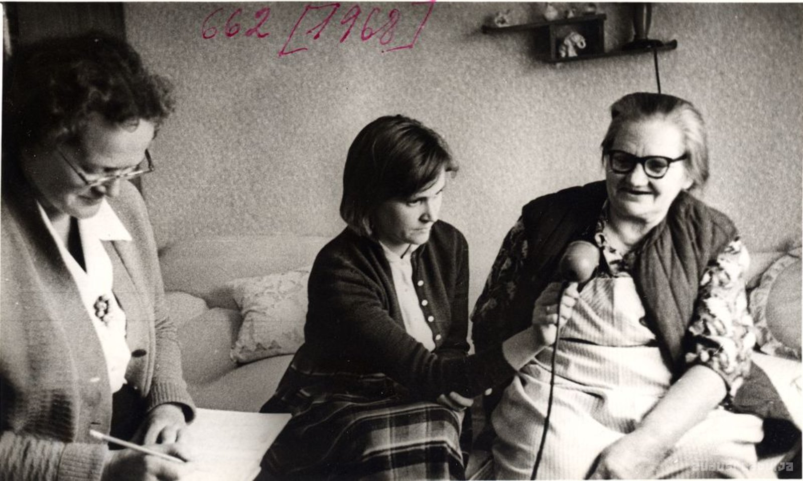 Teicēja Trīne Strautmane 70 gadu vecumā iedzied magnetafonā Dobelē 1964. gadā. Latvijas Folkloras krātuves (tagad nosaukums Latvijas Universitātes Literatūras folkloras un mākslas institūts) folkloras materiālu vākšanas ekspedīcija. Ekspedīcijas darbinieces Alma Ancelāne un Anita Stelle