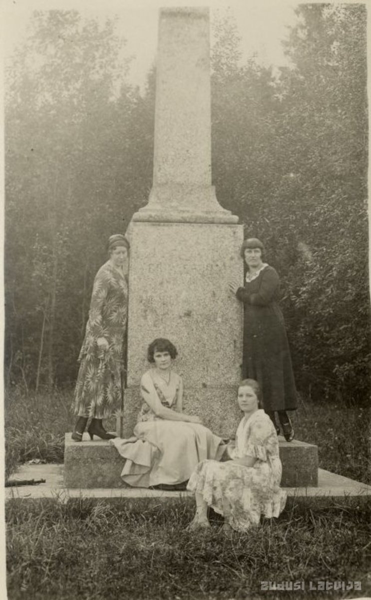Jaungulbenes muiža. Sievietes pie obeliska muižas pils parkā