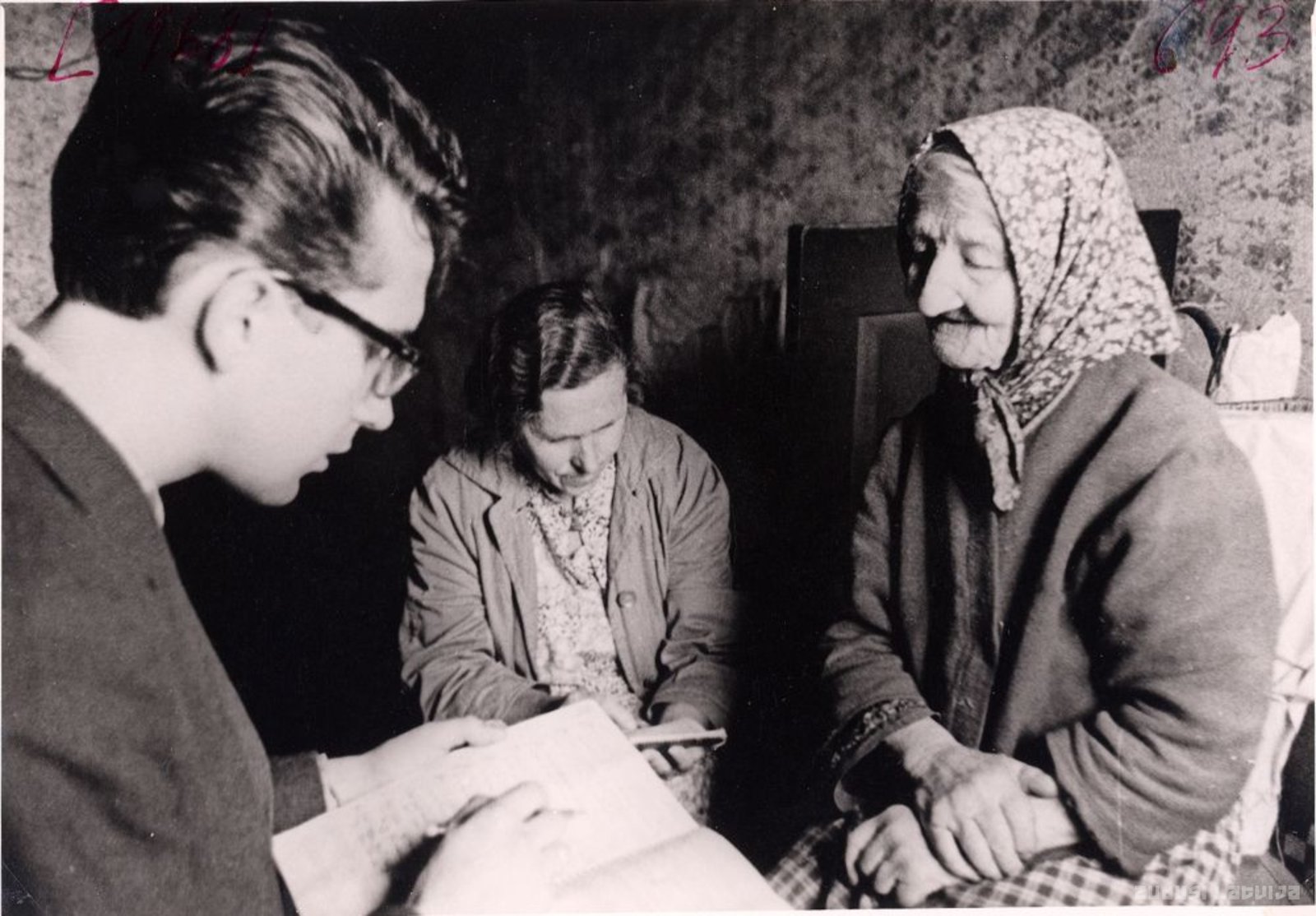 Teicēja Karlīne Purviņa dzied dziesmu: "Sieviņa turēja kudlainu āzīt!" Latvijas Folkloras krātuves (tagad nosaukums Latvijas Universitātes Literatūras folkloras un mākslas institūts) folkloras materiālu vākšanas ekspedīcija, dalībnieki A. Siliņa un Arvīds Bomiks