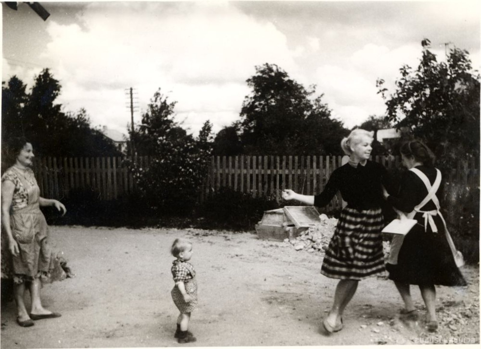 Teicējas Jansone Elizabete un Valmane Elza rāda deju kadrilli. Latvijas Folkloras krātuves (tagad nosaukums Latvijas Universitātes Literatūras folkloras un mākslas institūts) darbiniece Māra Bajāre dejo un pieraksta dejas soļus