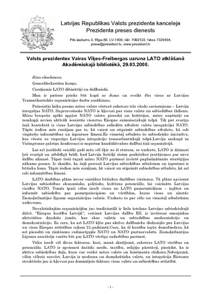 Valsts prezidentes Vairas Vīķes-Freibergas uzruna LATO atklāšanā Akadēmiskajā bibliotēkā, 29.03.2000.