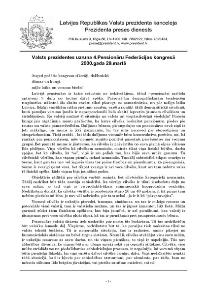 Valsts prezidentes uzruna 4.Pensionāru Federācijas kongresā 2000.gada 29.martā