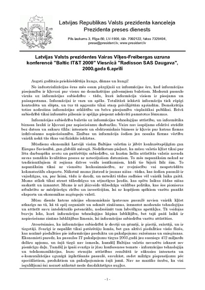 Latvijas Valsts prezidentes Vairas Vīķes-Freibergas uzruna konferencē "Baltic IT&T 2000" Viesnīcā "Radisson SAS Daugava", 2000.gada 6.aprīlī