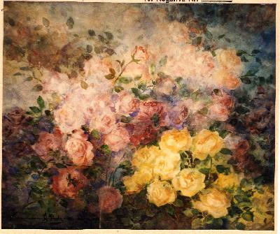 Priekšmeta apraksts: Kompozīcija ar maigi rozā un dzeltenām rozēm. Apakšā pa kreisi autora paraksts: RPerle 1911.