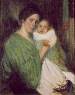 Priekšmeta apraksts: Attēlota sēdoša tumšmataina sieviete zaļā tērpā, piespiedusi sev klāt baltā audumā ietītu bērniņu.