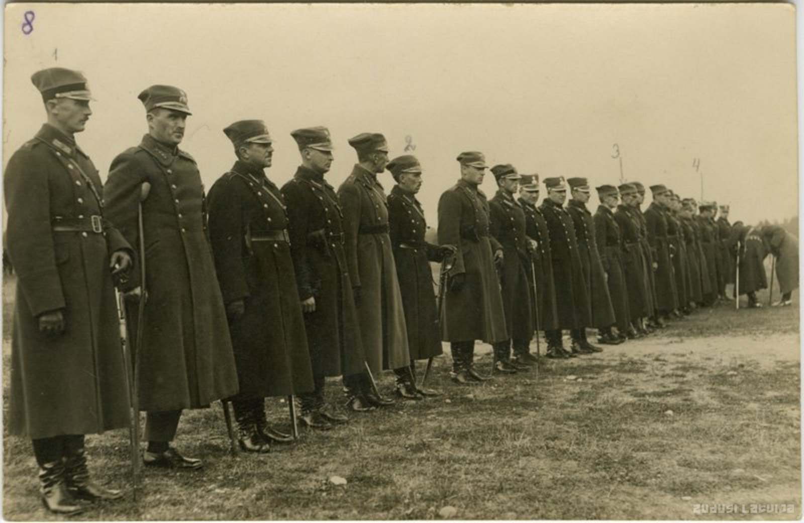 Latvijas armijas karavīri kopā ar Virsseržantu Kreimu, Kapteini Steblberg