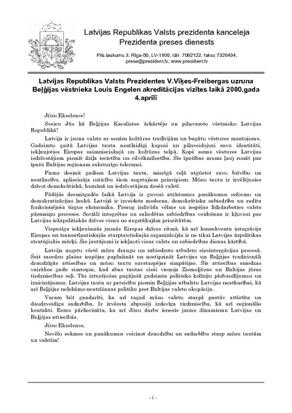 Latvijas Republikas Valsts Prezidentes V.Vīķes-Freibergas uzruna Beļģijas vēstnieka Louis Engelen akreditācijas vizītes laikā 2000.gada 4.aprīlī