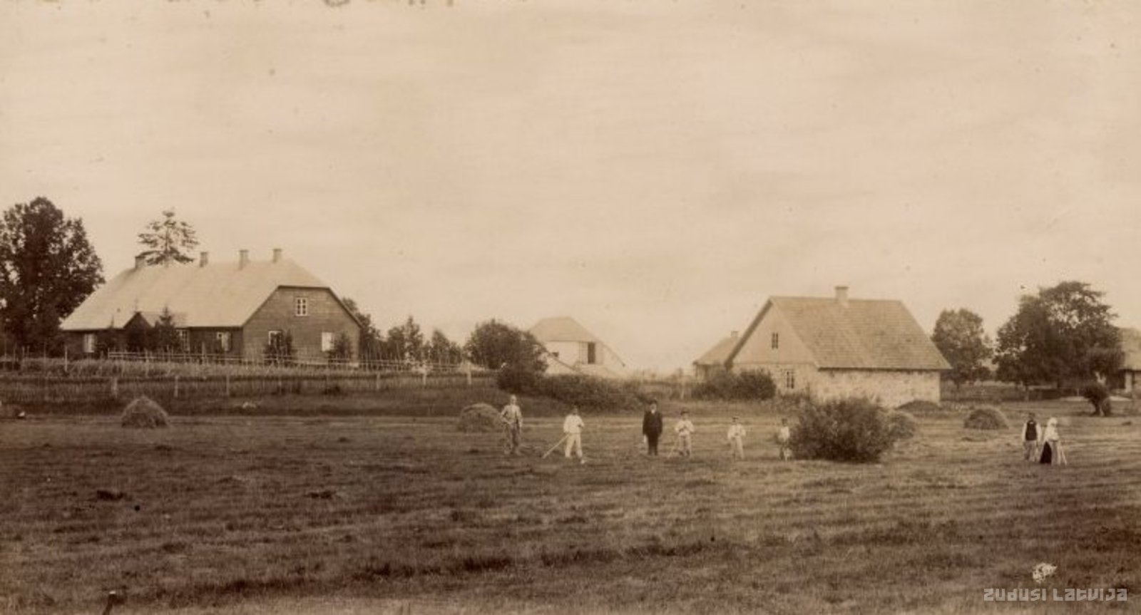 Plāņi. Talcinieki siena pļavā pie lauku mājām