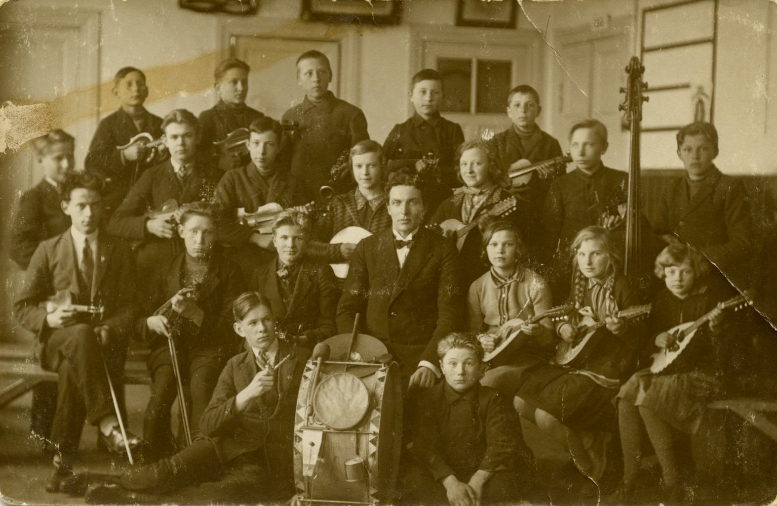 | 1. | Aizputes pamatskolas orķestris | Aizputes pamatskolas orķestris. Centrā diriģents Kr. Jankovskis. Iekšskats. Uz grīdas sēž 2 zēni, vidū bungas, uz sola sēž 3 zēni, vīrietis, 3 meitenes, stāv 10 zēni, 2 meitenes. Bērniem rokās mūzikas instrumenti. Melnbalts foto. Otrā pusē zīmogs "Foto K. CELMIŅ Aizputē, Boja ielā 16". | 234.89 KB | 77abcfeaf75744849f75845453b17ad7 | Nav tiesības lejupielādēt datni |