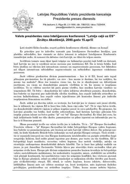 Valsts prezidentes runa Inteliģences konferencē “Latvija ceļā uz ES” Zinātņu Akadēmijā, 2000.gada 15.aprīlī