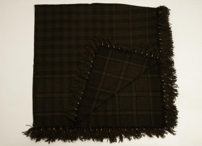 Priekšmeta apraksts: Vilnas sega. Darināta no diviem gabaliem, kas vidū sašūti kopā. Tumši brūnos toņos, ar bārkstīm. Bārkstis savāktas pušķos, kas pārsieti ar dzelteniem, oranžiem un sarkaniem vilnas diegiem.