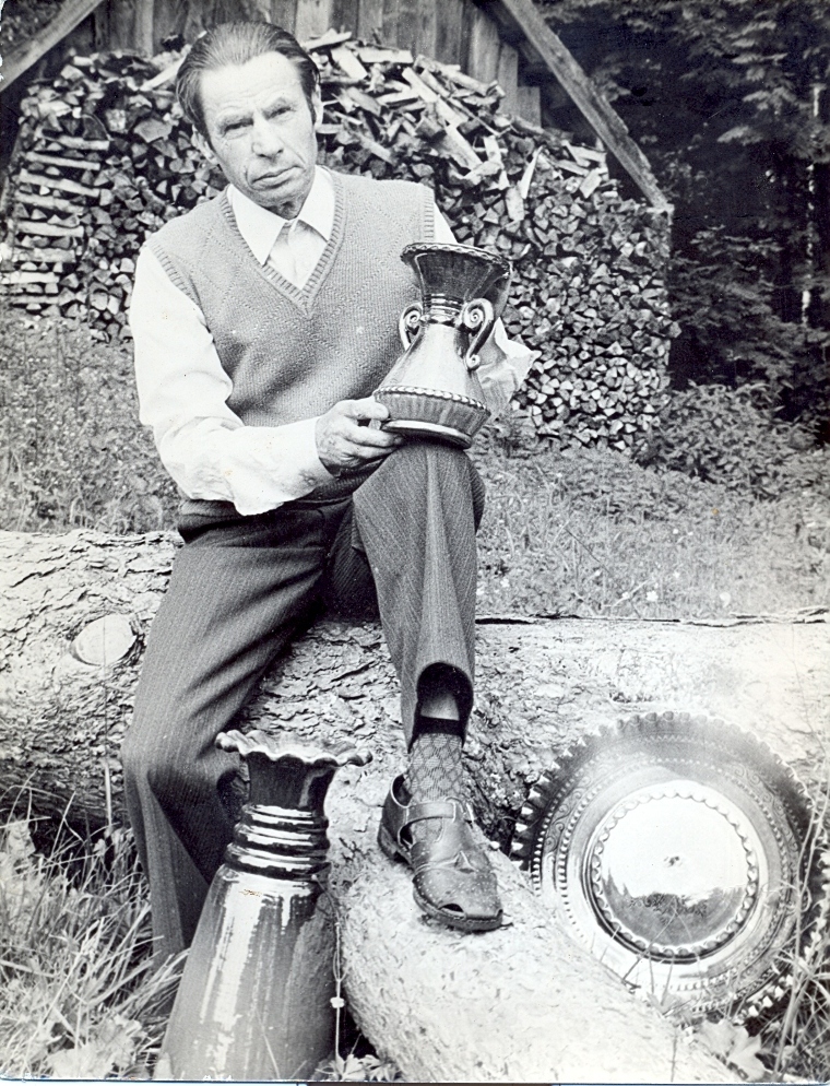 Satura apraksts: Keramiķis Polikarps Čerņavskis Preiļu raj., Silajāņu pag., Babru s., 1980-tajos gados ar saviem keramikas izstrādājumiem.