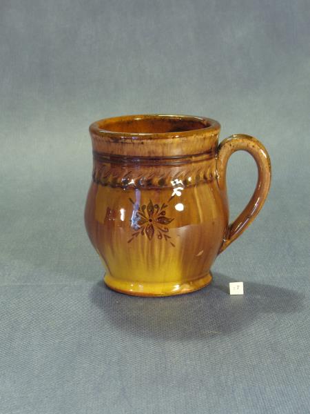 Priekšmeta apraksts: Dzeramā krūze profilēta, ar osu, ar paplatinājumu vidusdaļā. Rotāta ar divām virpas rievān pie augšmalas, iespiestu bedrīšu joslu uz plastiskā uzbiezinājuma zemāk, skrāpēto "saulites" rakstu vidusdaļā. Glazūra dzeltenbrūna ar notecējumiem, uz leju gaišāka.