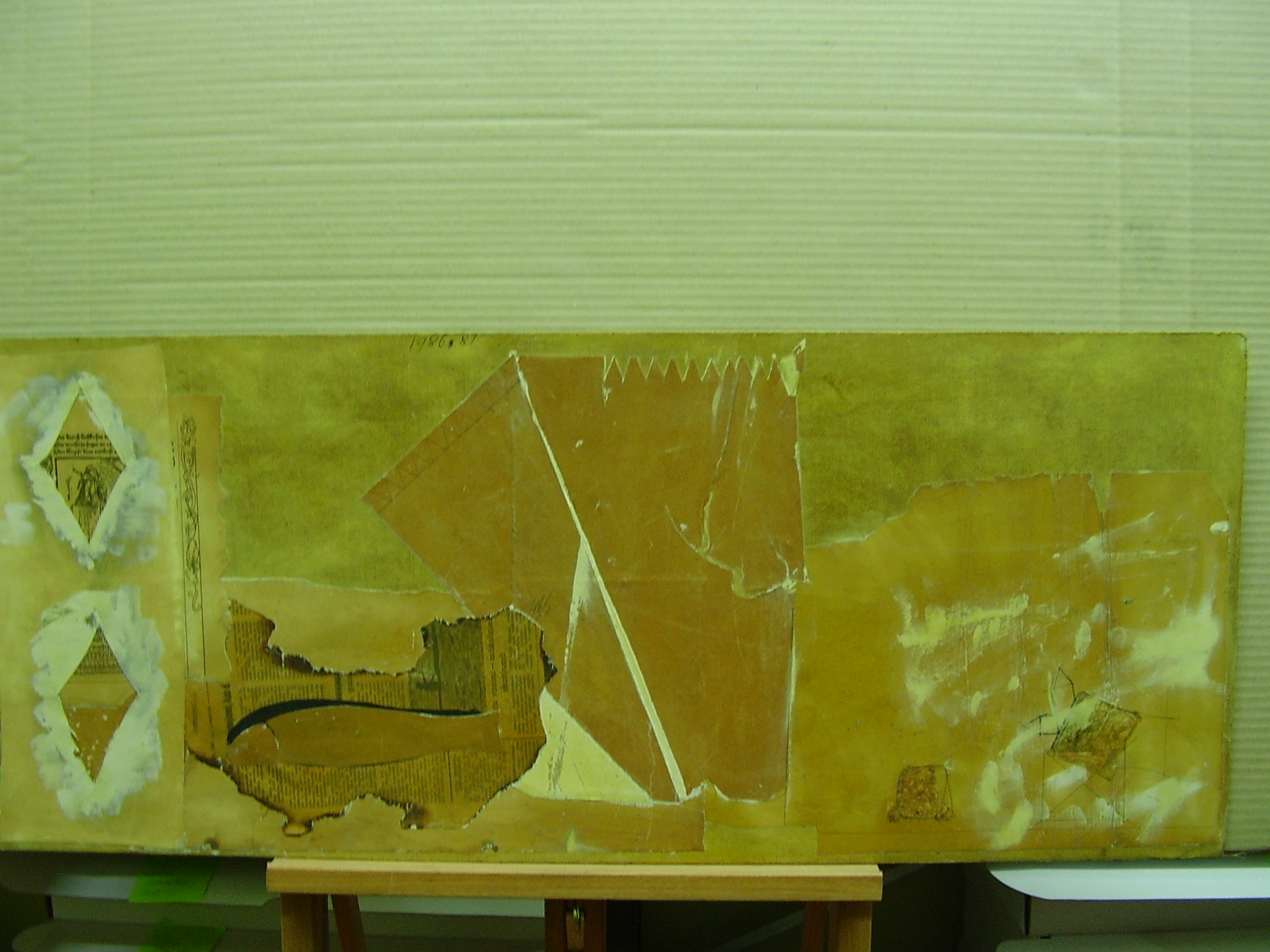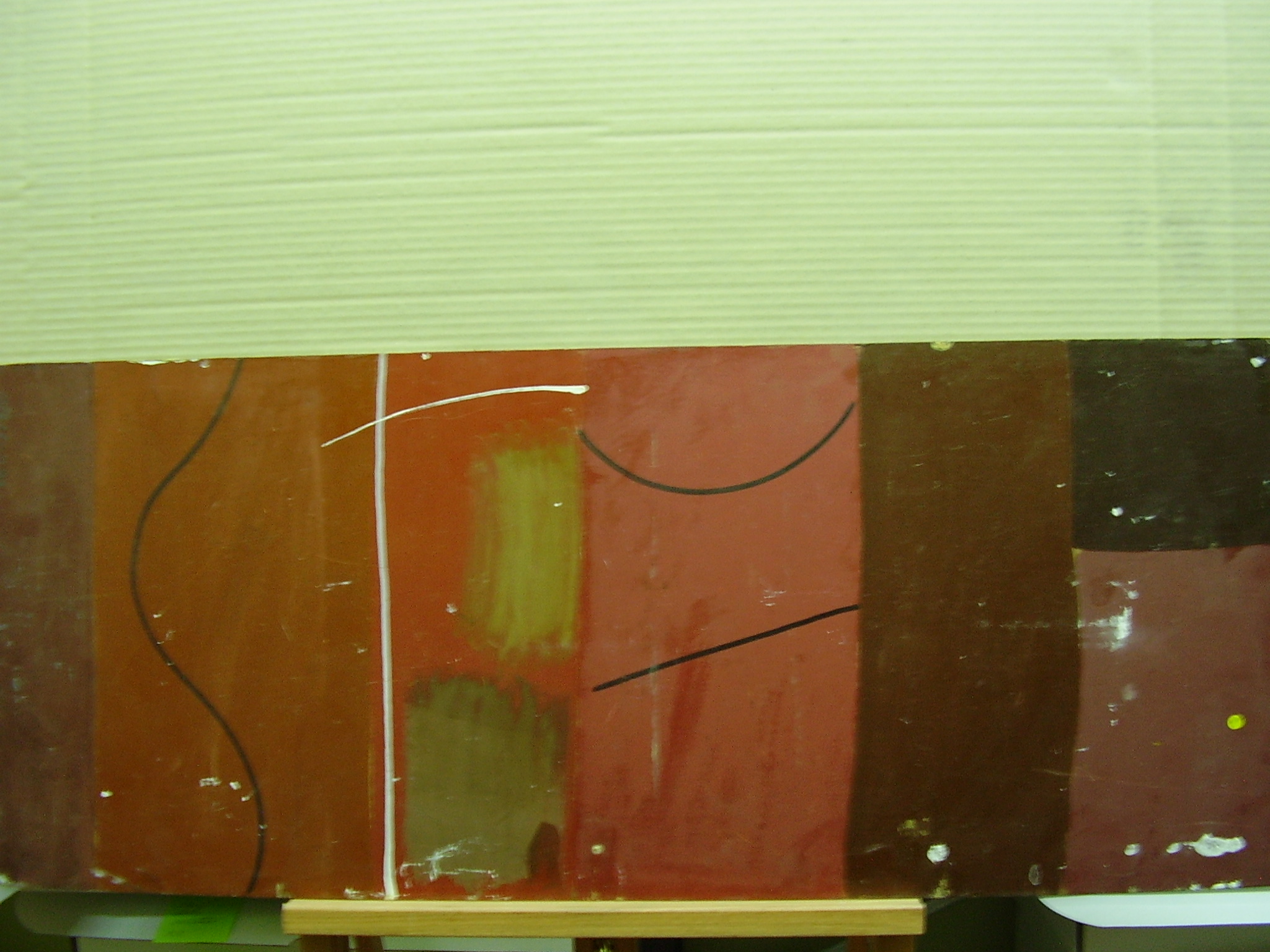 Priekšmeta apraksts: Pa visu virsmu papīru uzlīmes, krāsojumi, zīmēti dekoriņi.Vidū augšā uzraksts ar lodīti- 1986.87 Otra puse ar sarkani brūnām krāsu joslām, melnas un baltas līnijas.