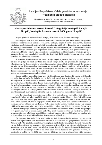 Valsts prezidentes uzruna forumā "Integrācija Ventspilī, Latvijā, Eiropā", Ventspils Biznesa centrā, 2000.gada 29.aprīlī