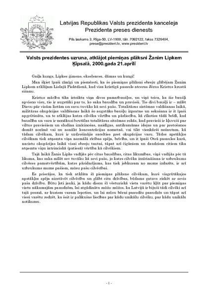 Valsts prezidentes uzruna, atklājot piemiņas plāksni Žanim Lipkem Ķīpsalā, 2000.gada 21.aprīlī