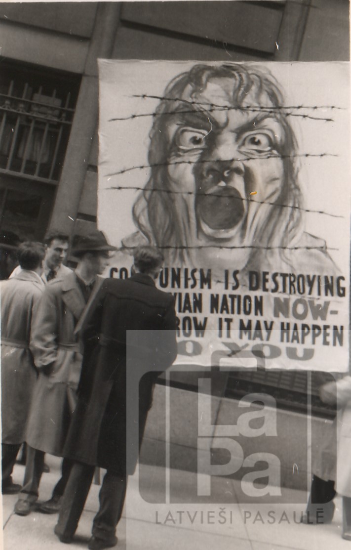 Latvieši piedalās tradicionālā "Lojalitātes Dienas" parādē Ņujorkā, ASV, 1953. gada 2. maijā. Parādes dalībnieki pauda prasību pēc Padomju Savienības okupēto zemju atbrīvošanas, ieskaitot latviešu grupu, kurā bija aptuveni 300 dalībnieku. Grupa nesa iespaidīgus plakātus, ieskaitot H. Gricēviča darinātu plakātu ar samocītu seju, uz tā uzraksts "Komunisms šodien iznīcina latviešu tautu, bet rīt tas var notikt arī jums". Lielo plakātu ar lāci uz samītām Baltijas valstīm darināja E. Markēvičs.