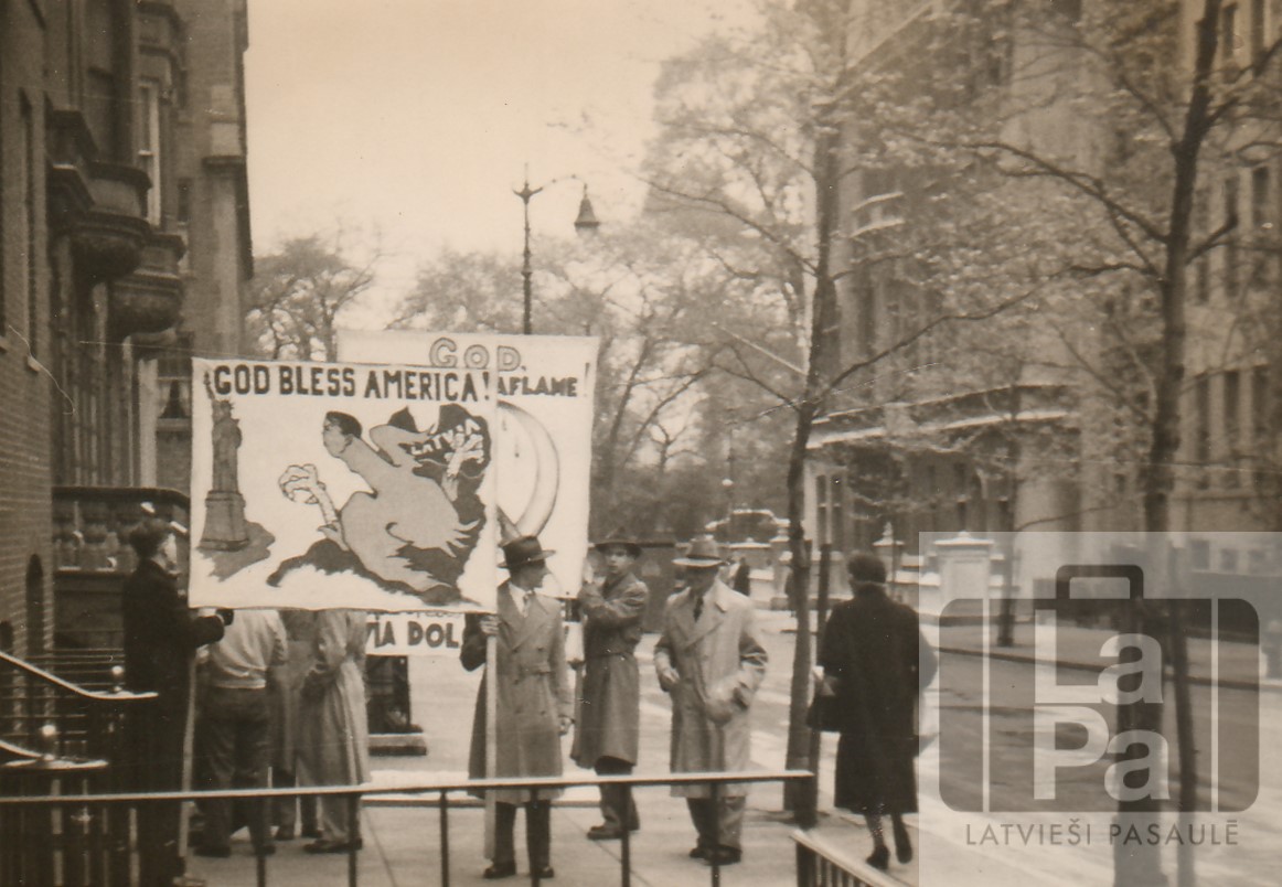 Latvieši piedalās tradicionālā "Lojalitātes Dienas" parādē Ņujorkā, ASV, 1953. gada 2. maijā. Parādes dalībnieki pauda prasību pēc Padomju Savienības okupēto zemju atbrīvošanas, ieskaitot latviešu grupu, kurā bija aptuveni 300 dalībnieku. Grupa nesa iespaidīgus plakātus, ieskaitot H. Gricēviča darinātu plakātu ar samocītu seju, uz tā uzraksts "Komunisms šodien iznīcina latviešu tautu, bet rīt tas var notikt arī jums". Lielo plakātu ar lāci uz samītām Baltijas valstīm darināja E. Markēvičs.