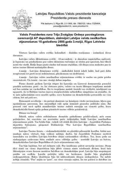 Valsts Prezidentes runa Triju Zvaigžņu Ordeņa pasniegšanas ceremonijā AP deputātiem, atzīmējot Latvijas valsts neatkarības atjaunošanas 10.gadadienu 2000.gada 3.maijā, Rīgas Latviešu biedrībā