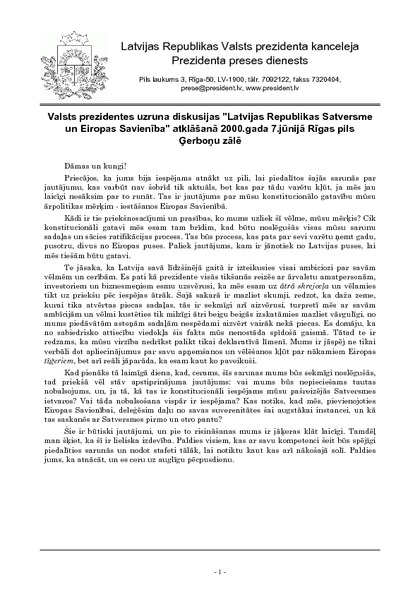 Valsts prezidentes uzruna diskusijas "Latvijas Republikas Satversme un Eiropas Savienība" atklāšanā 2000.gada 7.jūnijā Rīgas pils Ģerboņu zālē