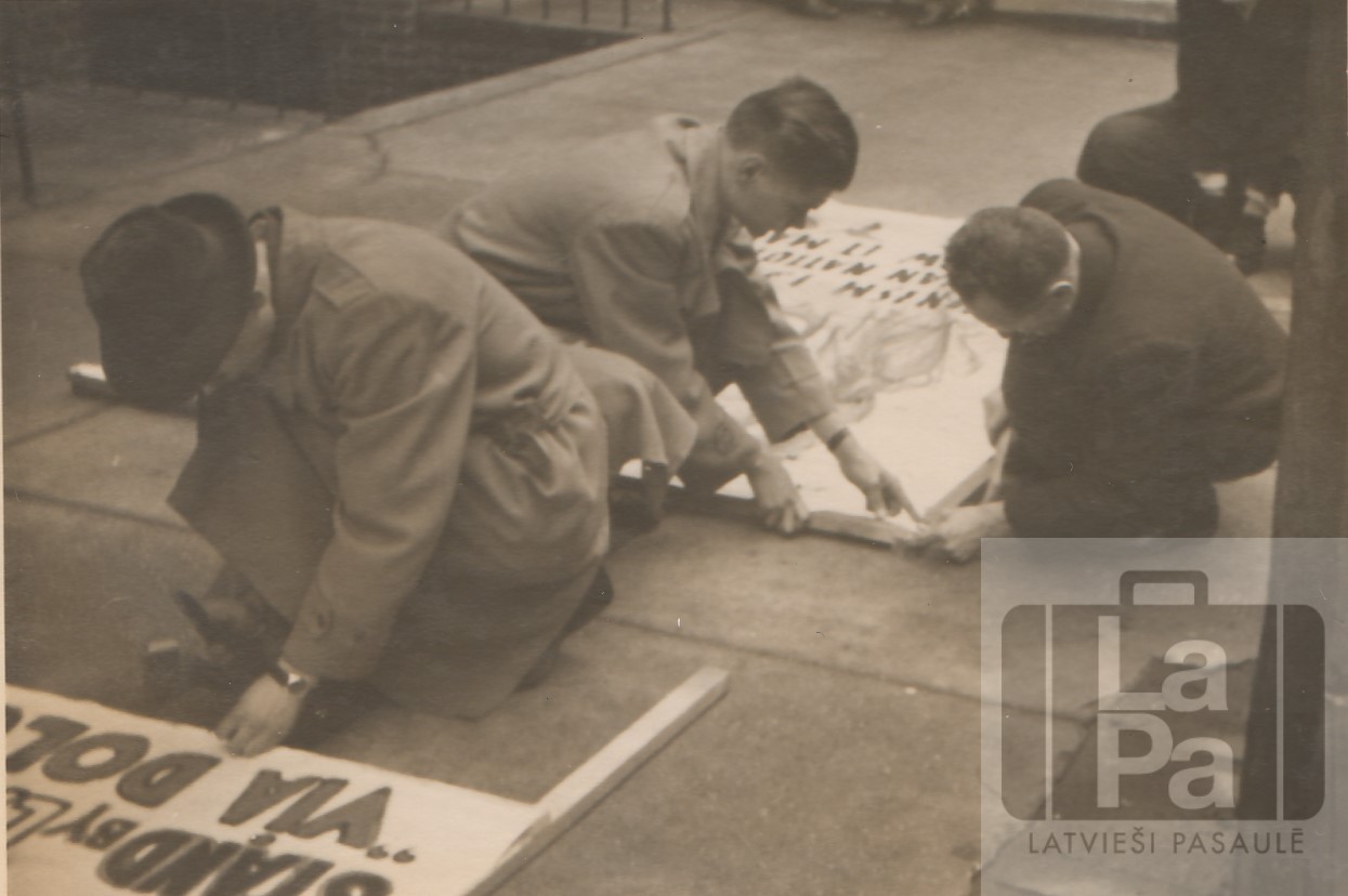 Latvieši gatavojas tradicionālās "Lojalitātes Dienas" parādei Ņujorkā, ASV 1953. gada 2. maijā. Parādes dalībnieki pieprasīja Padomju Savienības okupēto zemju atbrīvošanu, ieskaitot latviešu grupu, kurā bija aptuveni 300 dalībnieku. Grupa nesa iespaidīgus plakātus, tostarp H. Gricēviča darinātu plakātu ar samocītu seju un uzrakstu "Komunisms šodien iznīcina latviešu tautu, bet rīt tas var notikt arī jums". Lielo plakātu ar lāci uz samītām Baltijas valstīm darināja E. Markēvičs.