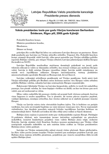 Valsts prezidentes tosts par godu Vācijas kancleram Gerhardam Šrēderam, Rīgas pilī, 2000.gada 6.jūnijā