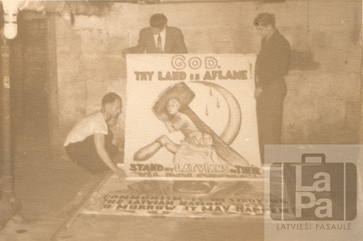 Latvieši gatavojas tradicionālās "Lojalitātes Dienas" parādei Ņujorkā, ASV 1953. gada 2. maijā. Parādes dalībnieki pieprasīja Padomju Savienības okupēto zemju atbrīvošanu, ieskaitot latviešu grupu, kurā bija aptuveni 300 dalībnieku. Grupa nesa iespaidīgus plakātus, tostarp H. Gricēviča darinātu plakātu ar samocītu seju un uzrakstu "Komunisms šodien iznīcina latviešu tautu, bet rīt tas var notikt arī jums". Lielo plakātu ar lāci uz samītām Baltijas valstīm darināja E. Markēvičs.