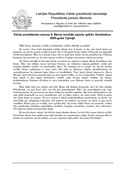 Valsts prezidentes uzruna 9. Bērnu invalīdu sporta spēlēs Ozolniekos, 2000.gada 3.jūnijā