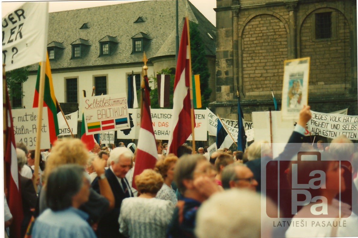 Demonstrācija baltiešu dienās Bonnā 1989. gada 23. augustā. Latvieši atgādina par Molotova-Ribentropa pakta nelikumību un pieprasa brīvību Baltijai. Demonstrācijā piedalījās latvieši no dažādām Eiropas valstīm un folkloras kopa "Skandinieki" no Latvijas.