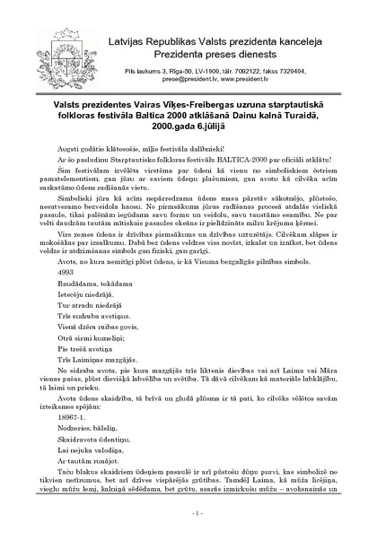 Valsts prezidentes Vairas Vīķes-Freibergas uzruna starptautiskā folkloras festivāla Baltica 2000 atklāšanā Dainu kalnā Turaidā, 2000.gada 6.jūlijā