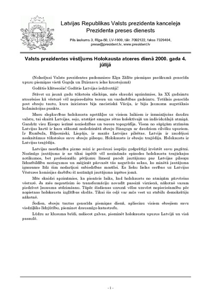 Valsts prezidentes vēstījums Holokausta atceres dienā 2000. gada 4. jūlijā