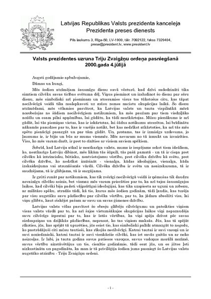 Valsts prezidentes uzruna Triju Zvaigžņu ordeņa pasniegšanā 2000.gada 4.jūlijā