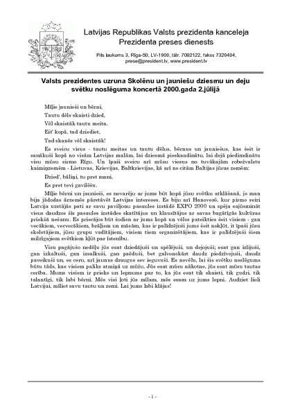 Valsts prezidentes uzruna Skolēnu un jauniešu dziesmu un deju svētku noslēguma koncertā 2000.gada 2.jūlijā